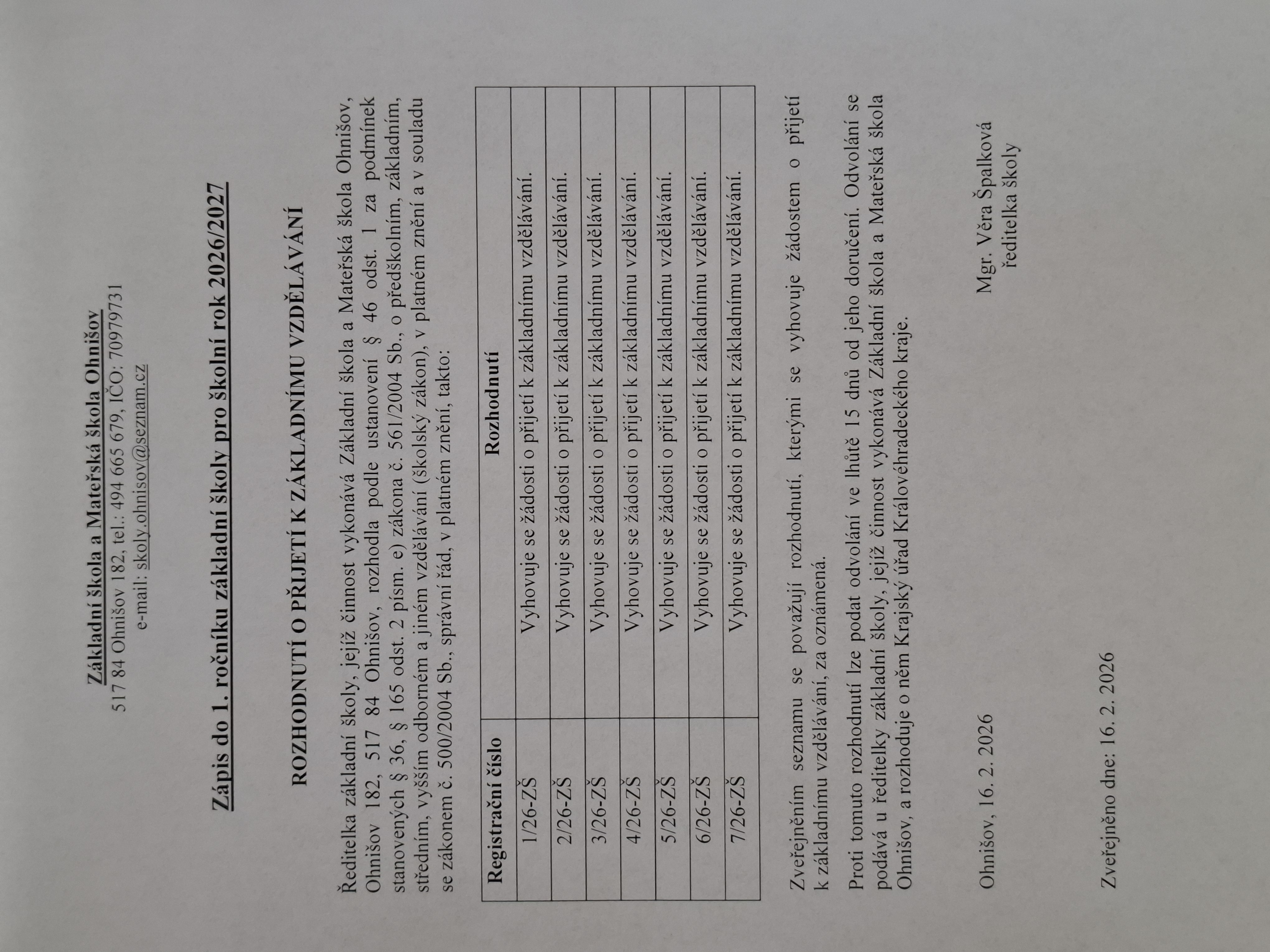 Výsledky zápisu ZŠ pro školní rok 2026/2027