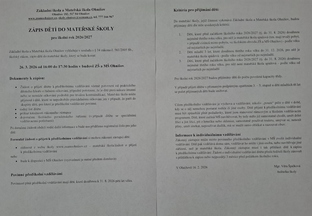 Bližší informace k zápisu naleznete v přiložených dokumentech.