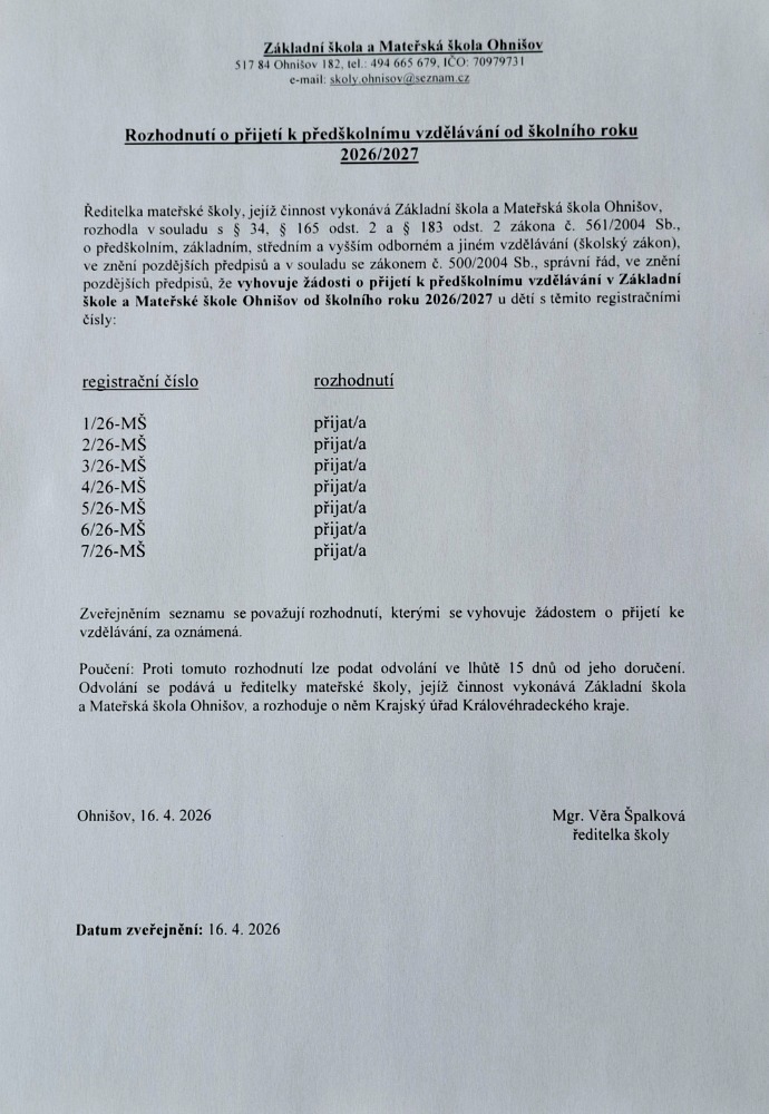Výsledky zápisu do MŠ pro školní rok 2026/2027