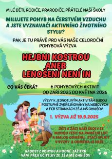 Milé děti, rodiče, prarodiče, přátelé naší školy, zapojte se do naší celoroční pohybové výzvy a užívejte si radost z pohybu a pobytu na čerstvém vzduchu