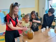 Ve středu 30. dubna se školáci pořádně čarodějnicky vyřádili. Nejprve si namíchali z různých ingrediencí kouzelné lektvary. K nim si připravili také něco na zub – ježibabí chlebíčky a slaďoučké perníčky. Venku si protáhli svá těla při běhacím čarodějnickém kvízu, skákání v pytli, běhu v sedmimílových botách nebo letu na koštěti. Byl to ale čarodějnicky vydařený den.